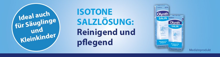 Olynth® Salin ist eine salzhaltige Lösung, die zur unterstützenden Behandlung einer verstopften Nase so-wie zur Reinigung und Befeuchtung der Nasenschleimhäute angewendet wird. Bei Schnupfen, aber auch bei Belastung durch Pollen oder Hausstaub wird das dickflüssige Sekret verflüssigt und kann besser ab-fließen, das Putzen der Nase wird erleichtert.